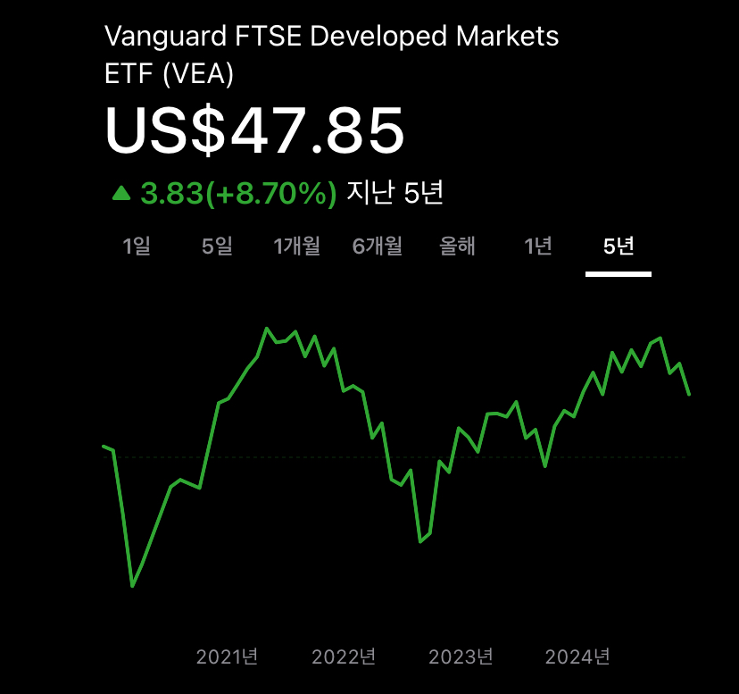 미국을 제외한 선진국 주식 시장을 추종하는 ETF로, 시가총액은 약 1,257억 달러이며, 운용 보수는 0.05%입니다.