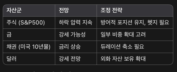 현재 시장은 미국의 보호무역 조치와 인플레이션 우려 속에서 변동성이 확대될 가능성이 큼. 이에 따라, 주식시장에서는 방어적인 전략이 필요하며, 금 및 달러 자산의 비중을 일부 늘리는 것이 유효한 대응책이 될 수 있음. 또한, 국채 금리 상승에 대비해 듀레이션을 조정하는 것이 중요함.